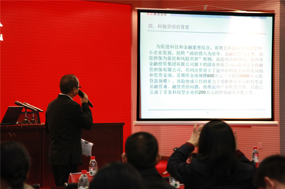 温州市金投融资担保有限公司董事长林小春讲解“科保贷”相关业务