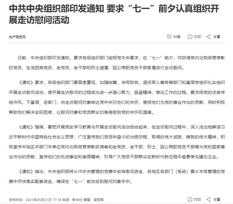 通知要求"七一"前夕认真组织开展走访慰问活动